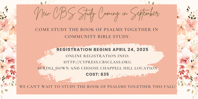 During weekly studies, participants explore the Bible along with what it tells us about the God who has woven His story through history and is present with us now.